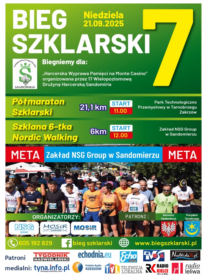 W niedzielę, 21 września 2025 r., odbędzie się siódma edycja Biegu Szklarskiego. Wydarzenie organizowane jest na rzecz „Harcerskiej Wyprawy Pamięci na Monte Cassino” prowadzonej przez 17 Wielopoziomową Drużynę Harcerską Sandomiria.