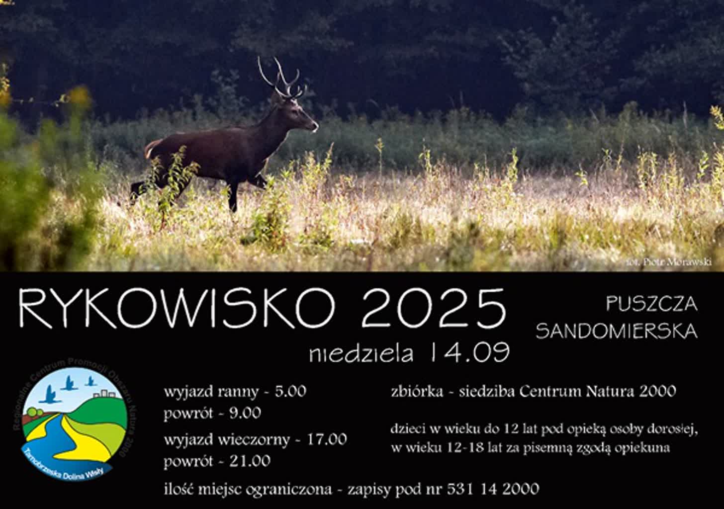 Rykowisko jest to czas zwiększonej aktywności tych zwierząt, co przy odrobinie szczęścia – daje nam możliwość także obserwacji. Zapraszamy na dwa wyjazdy – poranny, zaplanowany wcześnie, by być już na miejscu przed wschodem słońca oraz popołudniowy – zaplanowany na okres zachodu słońca. Pamiętajcie o odpowiednim obuwiu i odzieży. Szykujcie lornetki i obiektywy – informują organizatorzy.