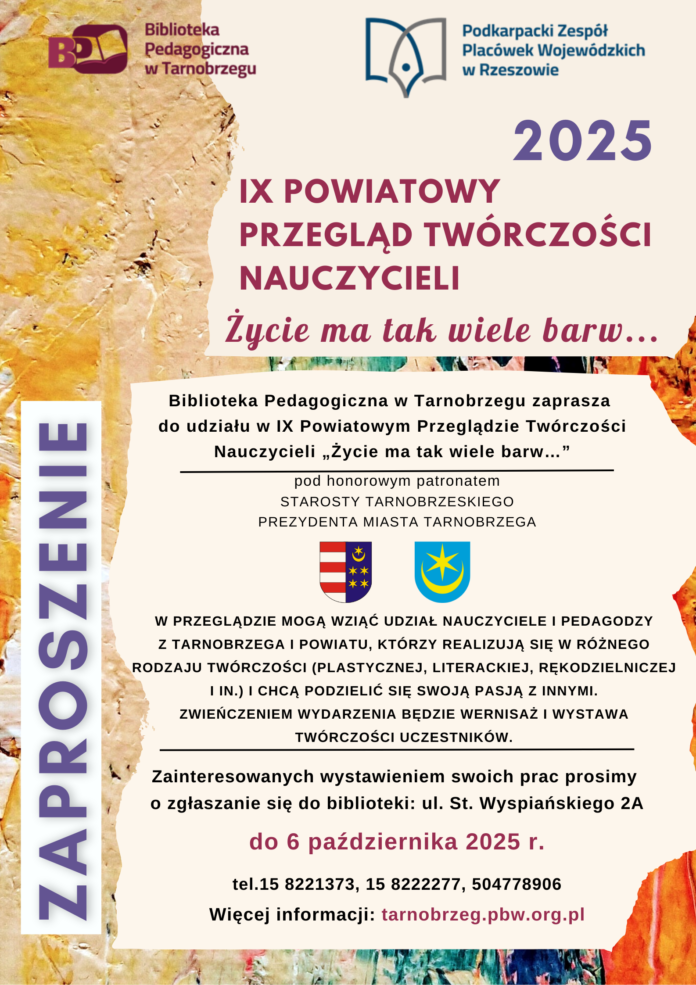 Biblioteka Pedagogiczna w Tarnobrzegu zaprasza do udziału w IX Powiatowym Przeglądzie Nauczycieli „Życie ma tak wiele barw…” pod honorowym patronatem Prezydenta Miasta Tarnobrzega.