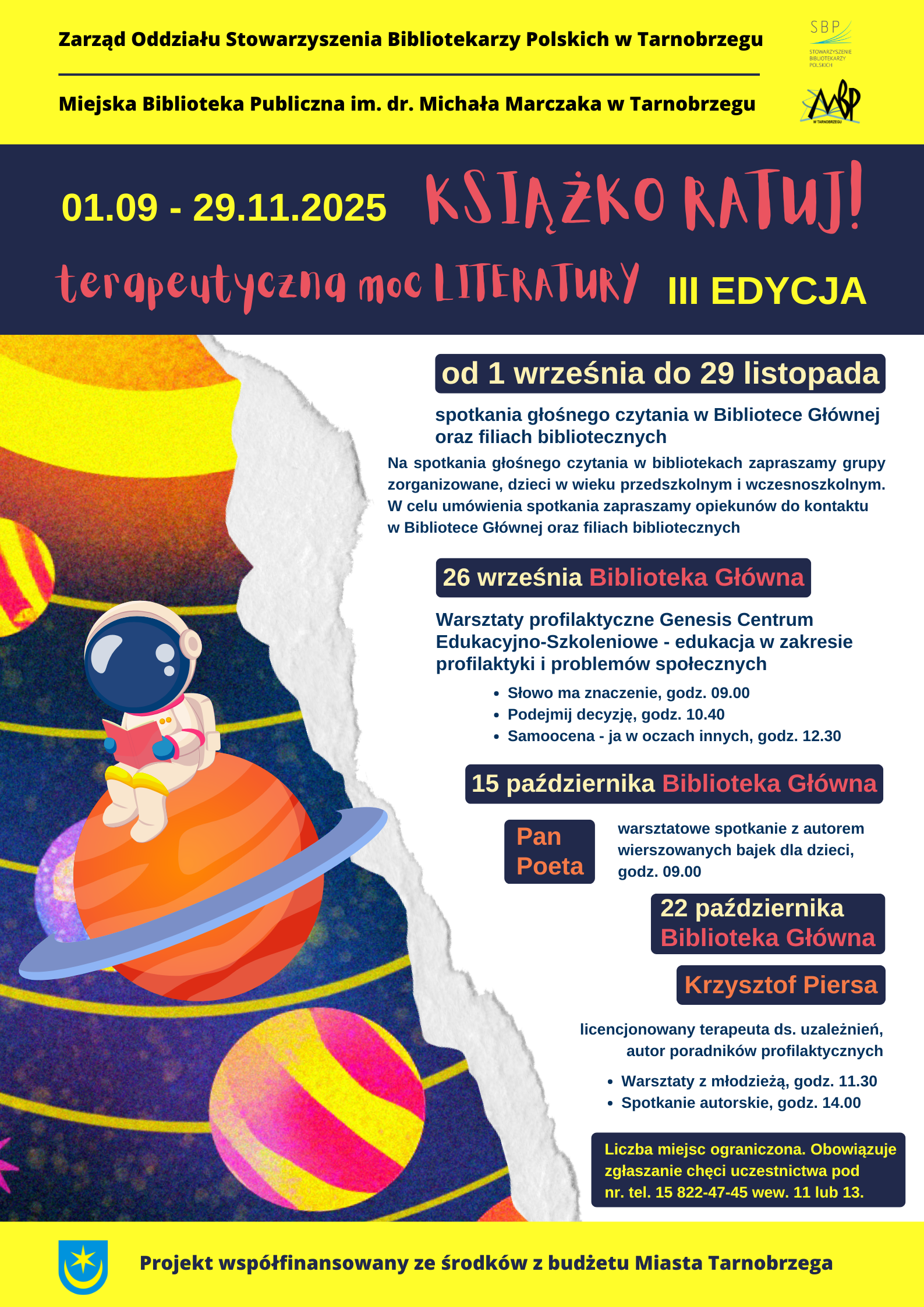 Liczba miejsc jest ograniczona, zapraszamy więc do wcześniejszego kontaktu telefonicznego (nr tel. 15 822-47-45 wew. 11 lub 13) w celu uzgodnienia udziału w spotkaniach organizowanych w ramach III edycji projektu „Książko ratuj! Terapeutyczna moc literatury”.