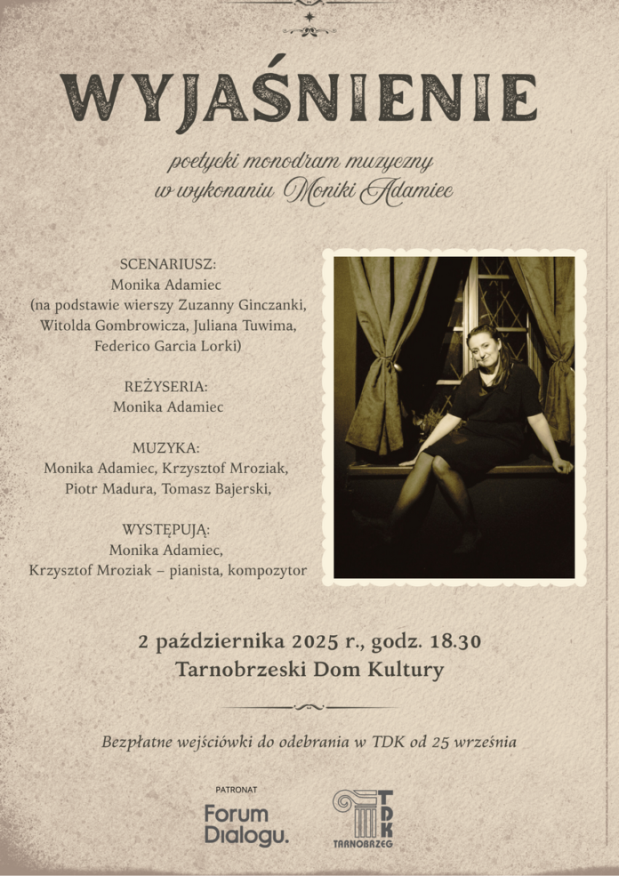2 października w Tarnobrzeskim Domu Kultury odbędzie się wydarzenie towarzyszące rocznicy wypędzenia przez Niemców żydowskich mieszkańców miasta. W południe zaplanowano Marsz Pamięci, a wieczorem organizatorzy zapraszają na niezwykłe wydarzenie artystyczne. „Wyjaśnienie” to poetycki monodram muzyczny Moniki Adamiec. Jak pisze autorka „to NieMonodram, NieRecital i NieKoncert”, to opowieść o poetyckim świecie dwudziestolecia międzywojennego i postaci wybitnej polskiej poetki żydowskiego pochodzenia, Zuzanny Ginczanki, jej życiu, twórczości i tragicznej śmierci. Spektakl opatrzony jest anegdotami i opowieściami o artystach – samej Zuzannie Ginczance, ale także jej współczesnych – Julianie Tuwimie, Witkacym, Witoldzie Gombrowiczu. Usłyszymy ich wiersze z autorską muzyką. Na scenie artystce będzie akompaniował pianista, kompozytor i aranżer – Krzysztof Mroziak.