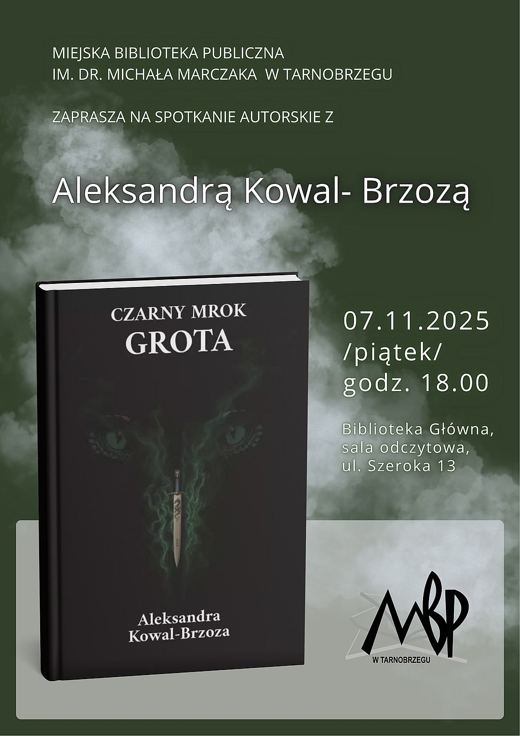 Miejska Biblioteka Publiczna w Tarnobrzegu zaprasza w piątek 7 listopada, o godz. 18:00 na spotkanie z Aleksandrą Kowal-Brzozą, która będzie promować swoją debiutancką powieść „Czarny motyl. Grota”. To książka pełna magii, demonów i uniwersalnych przesłań. Autorka wprowadzi do swojego literackiego świata, opowie o swojej pisarskiej drodze i marzeniach, które właśnie się spełniają.