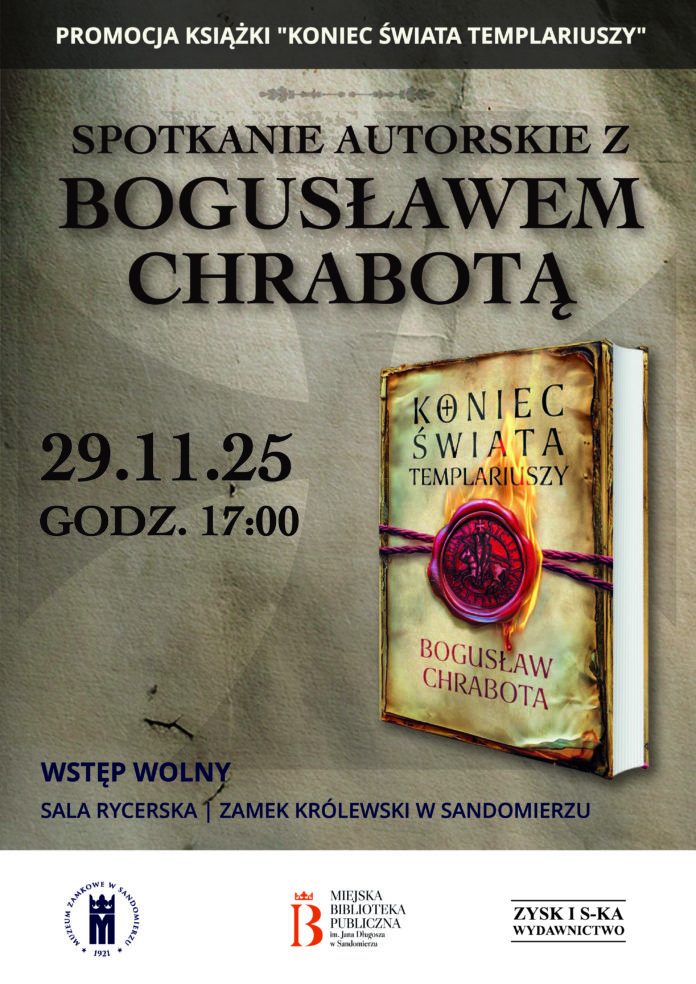 Muzeum Zamkowe w Sandomierzu zaprasza na spotkanie autorskie z Bogusławem Chrabotą, promujące jego najnowszą publikację zatytułowaną „Koniec świata Templariuszy”, która została wydana nakładem wydawnictwa Zysk i S-ka.