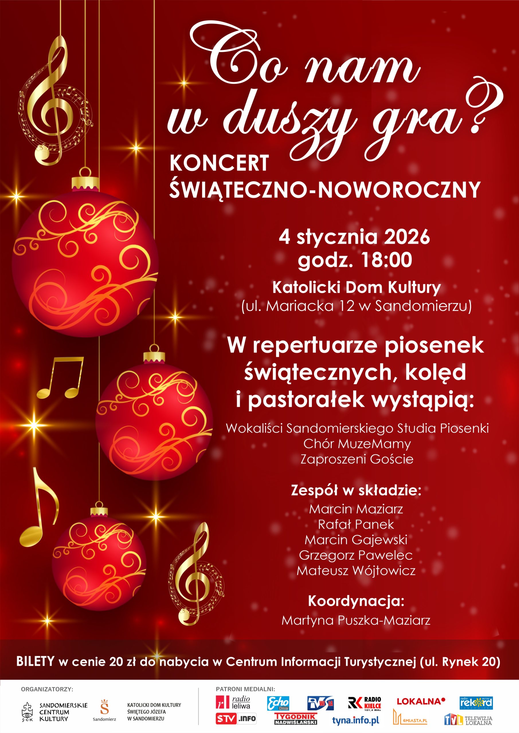 Sandomierskie Centrum Kultury serdecznie zaprasza na wyjątkowy Koncert Świąteczno-Noworoczny „Co nam w duszy gra?”, który odbędzie się 4 stycznia 2026 r. o godz. 18:00 w Katolickim Domu Kultury Świętego Józefa w Sandomierzu.