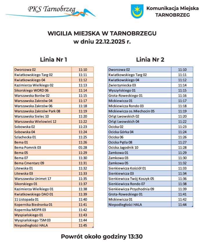 Rozkład jazdy autobusów miejskich, którymi będzie można dotrzeć na Wigilię Miejską 22 grudnia br.