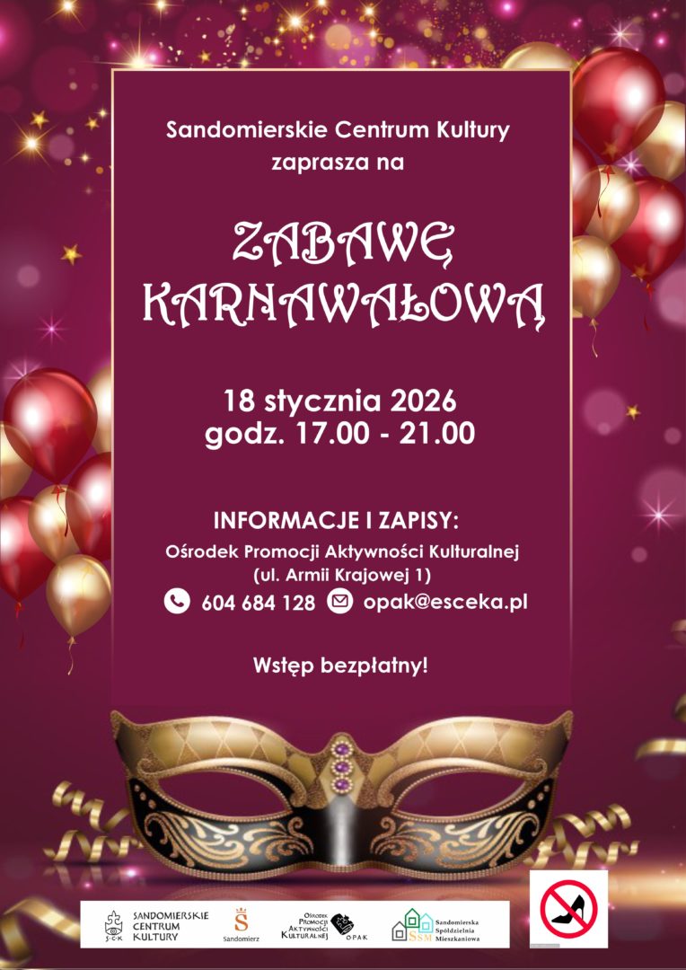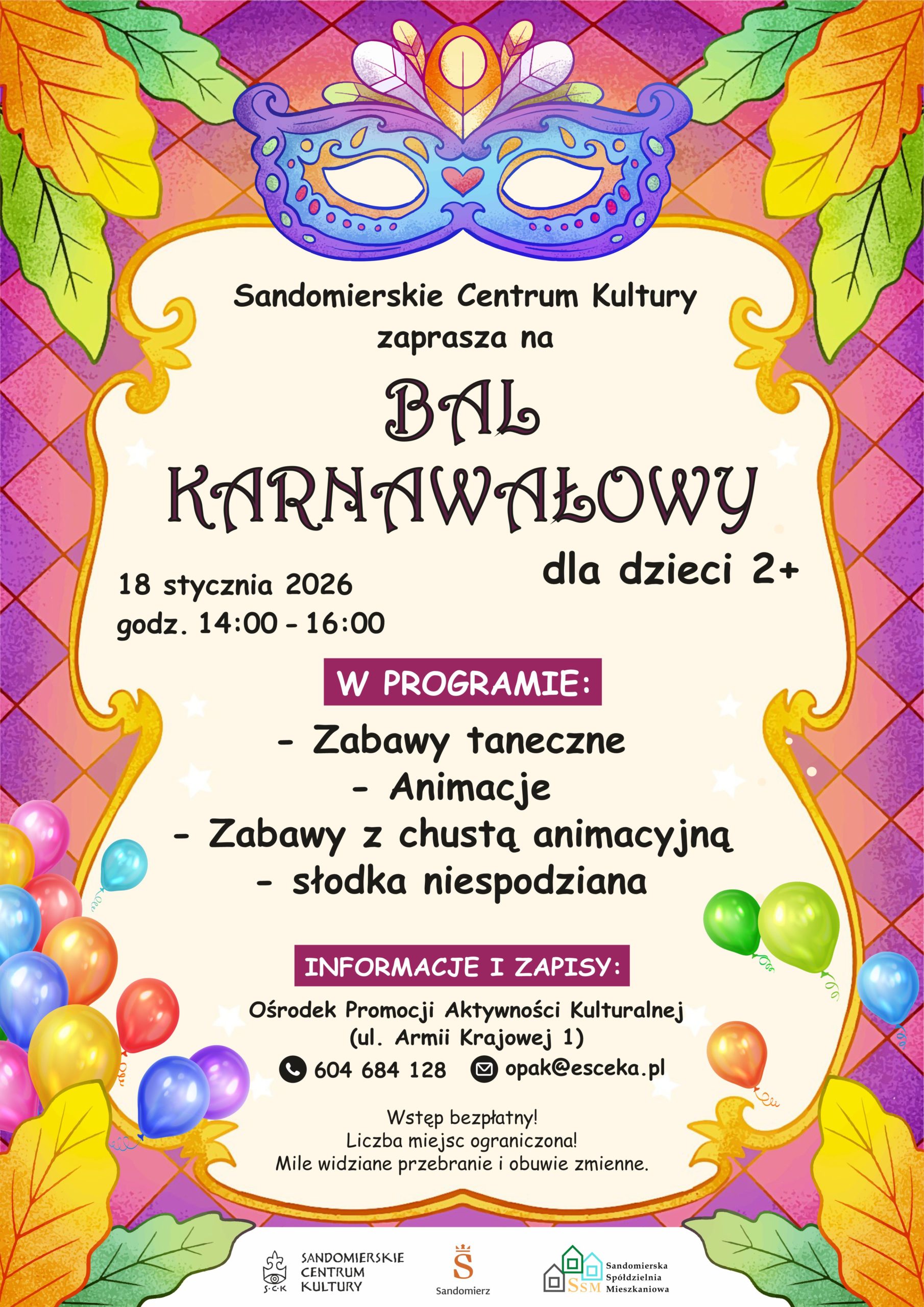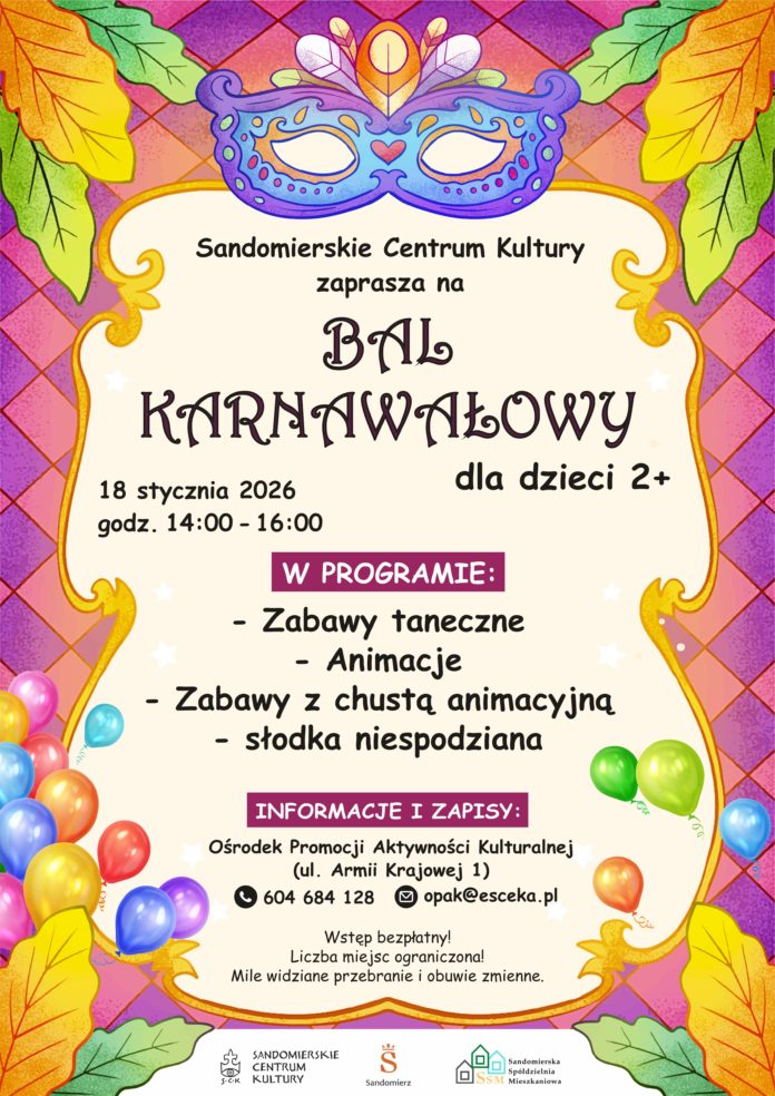 Sandomierskie Centrum Kultury i Urząd Miejski w Sandomierzu zapraszają do udziału w Balach Karnawałowych, przygotowanych zarówno dla dzieci, jak i dla dorosłych, które odbędą się 18 stycznia (niedziela) 2026 roku w Ośrodku Promocji Aktywności Kulturalnej w Sandomierzu.