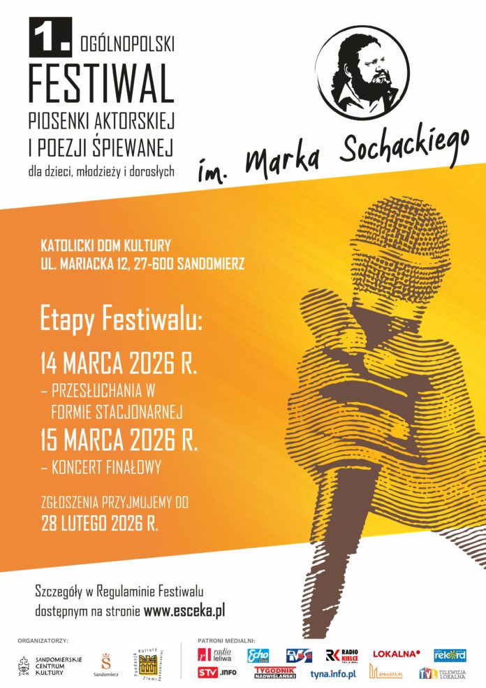 Sandomierskie Centrum Kultury zaprasza do udziału w I Ogólnopolskim Festiwalu Piosenki Aktorskiej i Poezji Śpiewanej im. Marka Sochackiego, który odbędzie się w dniach 14–15 marca 2026 roku w Katolickim Domu Kultury im. Świętego Józefa  Sandomierzu.