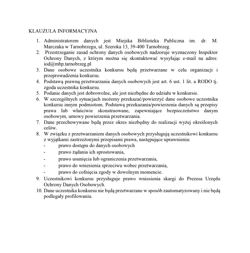 Szczegółowe informacje dotyczące zasad udziału, terminów i miejsca składania prac można uzyskać w Bibliotece Głównej oraz jej filiach bibliotecznych, jak również dostępne są na stronie internetowej Miejskiej Biblioteki Publicznej im. dr. Michała Marczaka w Tarnobrzegu www.mbp.tarnobrzeg.pl. Regulamin załączony jest również poniżej.