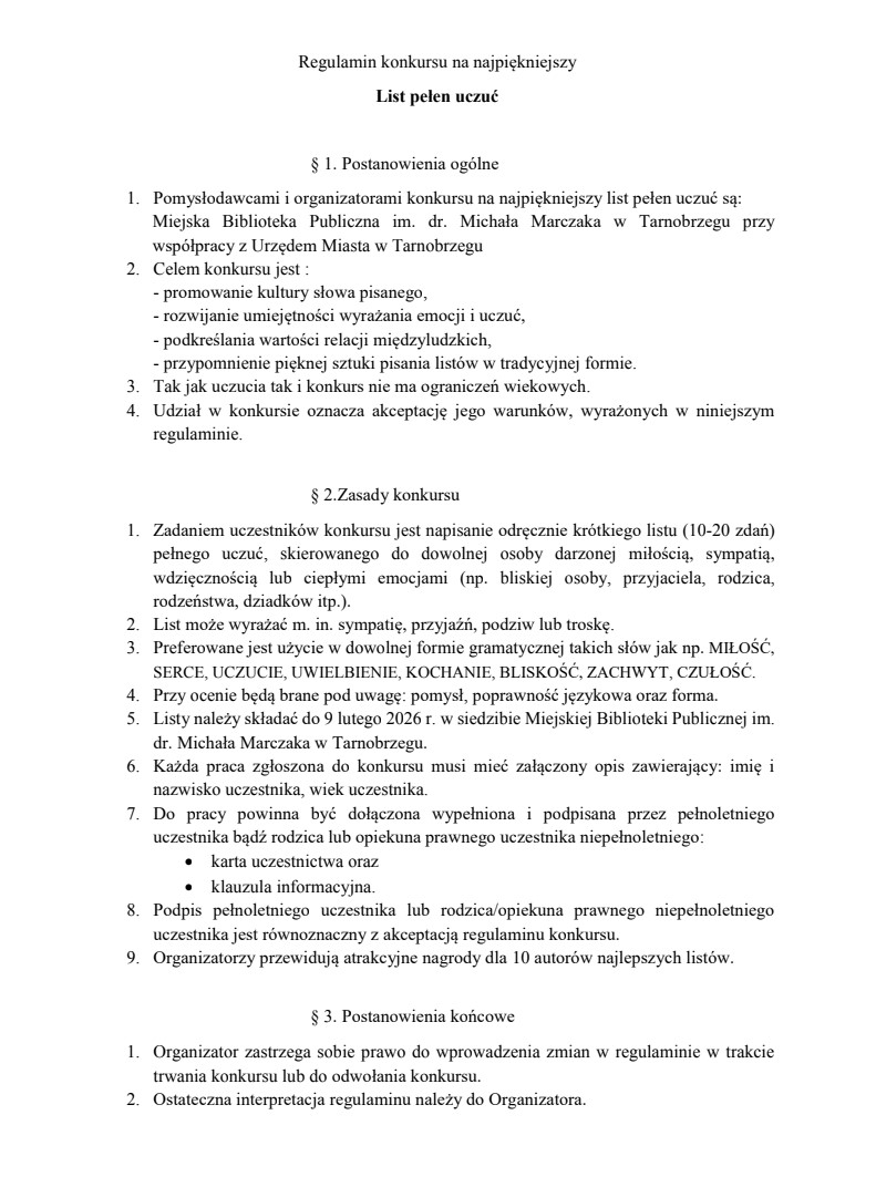 Urząd Miasta Tarnobrzega wraz z Miejską Biblioteką Publiczną zapraszają mieszkańców do udziału w walentynkowym konkursie literackim „List pełen uczuć”.