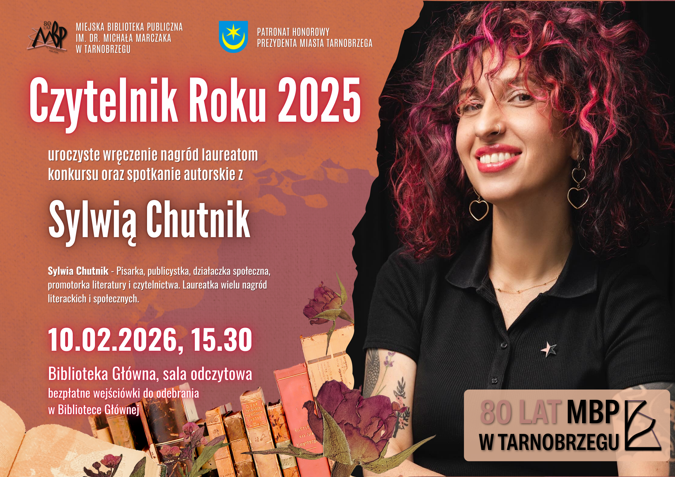 Miejska Biblioteka Publiczna w Tarnobrzegu zaprasza na uroczyste wręczenie nagród laureatom konkursu “Czytelnik Roku 2025” oraz spotkanie autorskie z Sylwią Chutnik.