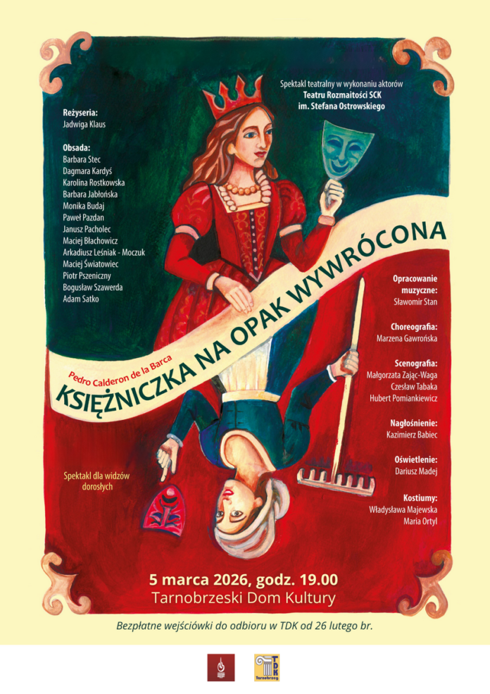 Śmiechu i zaskakujących zwrotów akcji nie zabraknie. Tarnobrzeski Dom Kultury zaprasza 5 marca na spektakl „Księżniczka na opak wywrócona”, który zaprezentuje Teatru „Rozmaitości” SCK w Mielcu. Spektakl miał swoją premierę w październiku zeszłego roku.  Autorem sztuki jest Pedro Calderón de la Barca, barokowy poeta i dramaturg hiszpański. Kilka jego sztuk na stałe weszło do repertuaru teatrów na całym świecie, m.in. „Życie jest snem”, czy „Wielki teatr świata”. Także spektakl „Księżniczka na opak wywrócona” często grywana jest w teatrach. Dlaczego? Bo publiczność kocha namiętności, intrygi, pojedynki, gry pozorów, zwroty akcji, zabawne qui quo pro… czyli stare, ale jare, sprawdzone konwencje teatralne. Ostatecznie chodzi o to, aby to, co było na opak, wróciło na właściwe miejsce i wszyscy byli zadowoleni. I żeby publiczność miała dużo radości i uśmiechu.