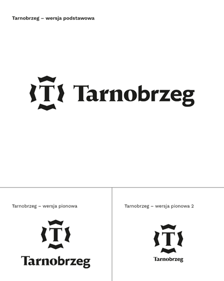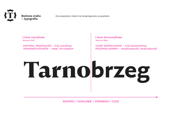 W typografii kontynuowaliśmy ideę „od przeszłości i historii do teraźniejszości i przyszłości”. Zaproponowaliśmy zapis nazwy miasta z wykorzystaniem dwóch wersji kroju: „Tarno” – krojem szeryfowym, nawiązującym do historii i dziedzictwa miasta, „brzeg” – krojem bezszeryfowym, odnoszącym się do nowoczesności, przyszłości oraz brzegu Jeziora Tarnobrzeskiego, z którym obecnie miasto jest silnie kojarzone przez turystów. W ten sposób idea przejścia od przeszłości do przyszłości została przedstawiona symbolicznie również w typografii.