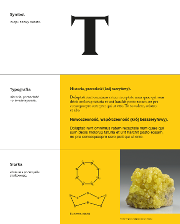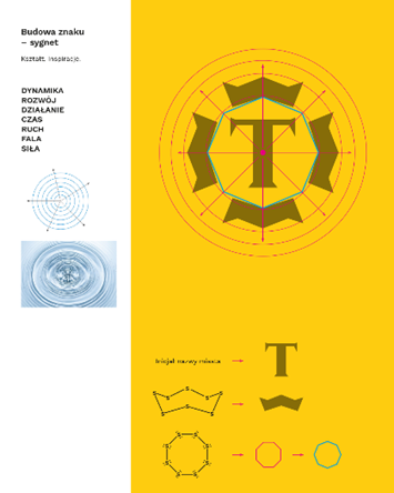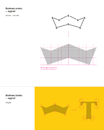 Punktem wyjścia do pracy nad sygnetem była budowa siarki. Na jej bazie opracowaliśmy mocną, wyrazistą i charakterystyczną formę graficzną. Kolejnym elementem kompozycji jest inicjał miasta – litera „T”. W projekcie wykorzystaliśmy polski krój szeryfowy Nocturne Serif. Jego ostre zakończenia (szeryfy) bardzo dobrze współgrają stylistycznie i formalnie z geometryczną formą inspirowaną budową siarki. Finalna forma sygnetu zawiera również odniesienia do wody i fali – Jeziora Tarnobrzeskiego oraz Wisły. Kręgi na wodzie są jednak czymś więcej niż tylko falą – to symbol energii, która rozchodzi się promieniście z jednego punktu do wielu miejsc, symbolizując rozwój, wpływ i oddziaływanie. Litera „T” stanowi centrum kompozycji – punkt początkowy, impuls, symboliczny początek historii miasta: 1593 r. – nadanie Tarnobrzegowi praw miejskich, historia rodu Tarnowskich, przeszłość miasta. Rozchodzące się promieniście formy inspirowane siarką symbolizują natomiast: 1953 r. – odkrycie złóż siarki, rozwój przemysłu siarkowego, współczesność, działanie, dynamikę i rozwój.